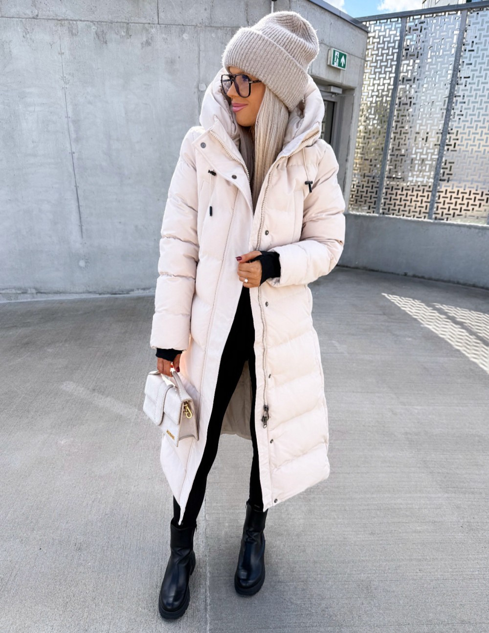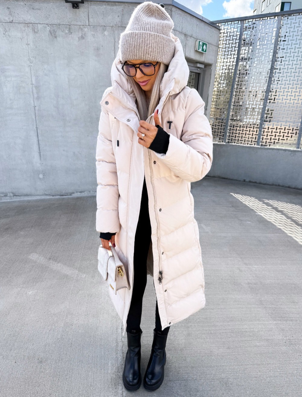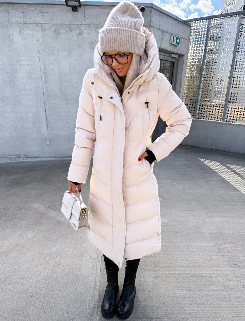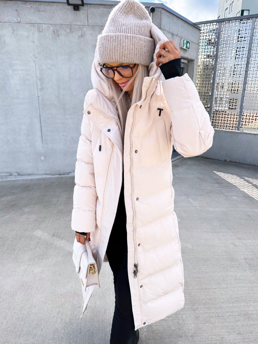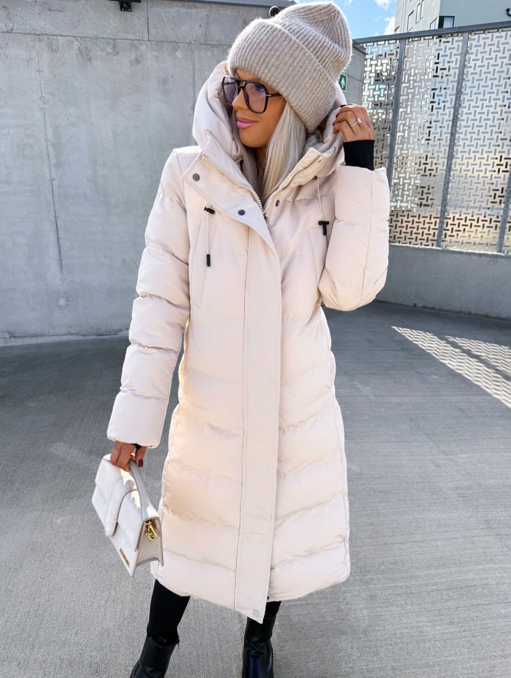 Dłuższa ciepła parka zimowa z kapturem (L, Jasny beż)