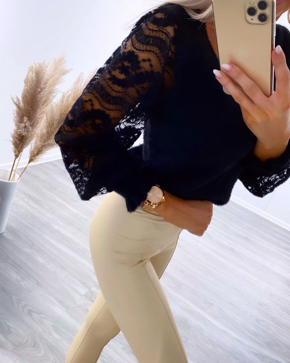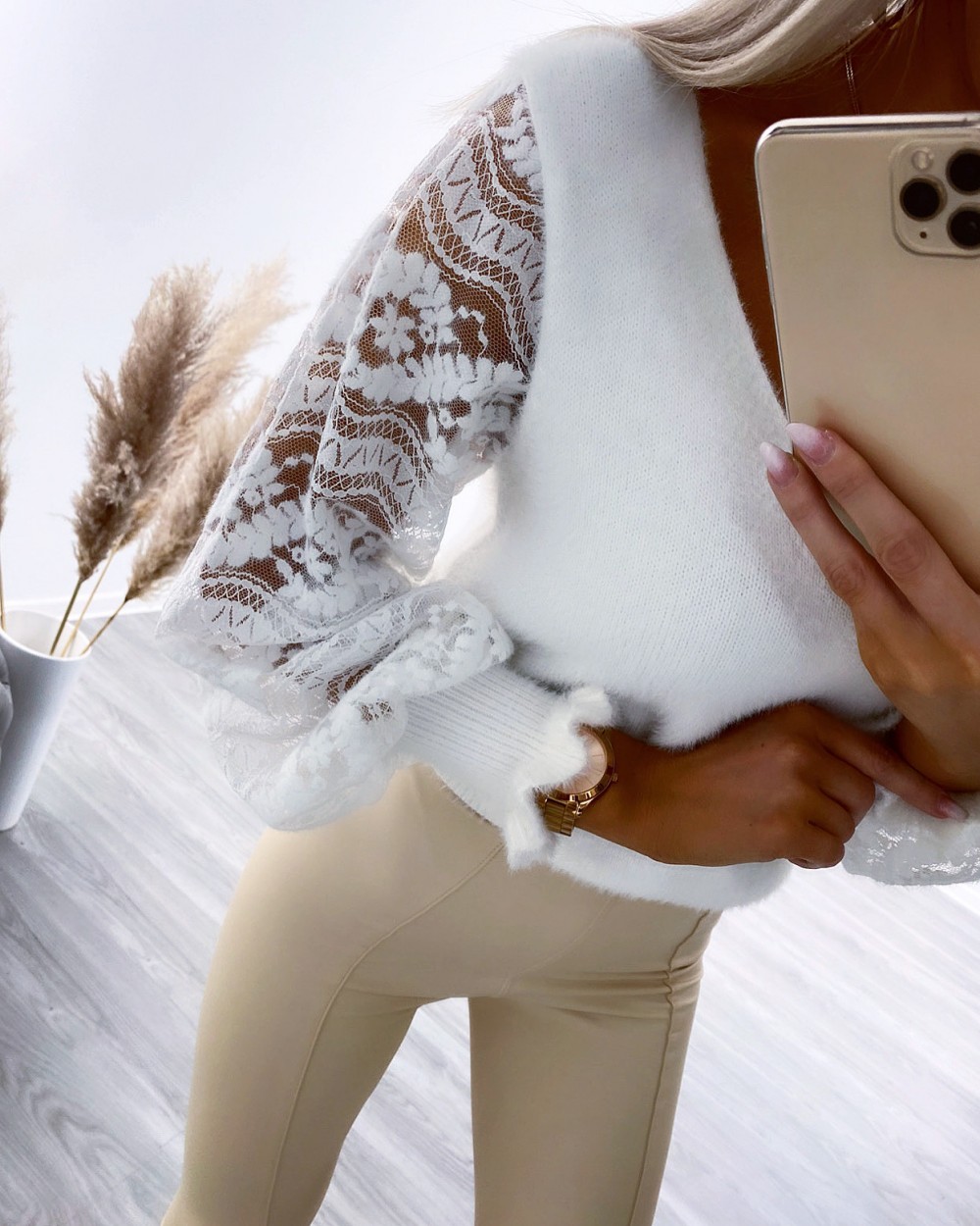 Мягкий свитер с кружевными рукавами (Один размер, Синий)