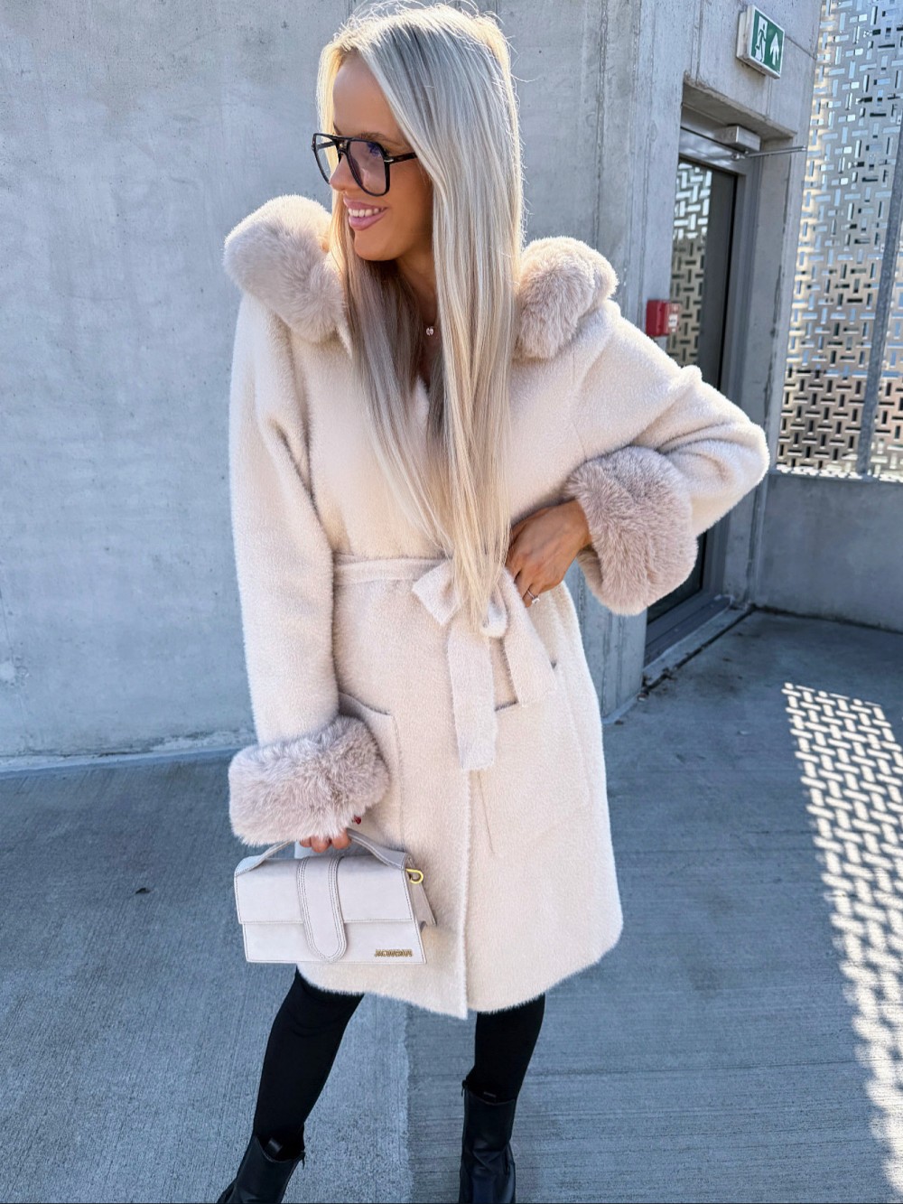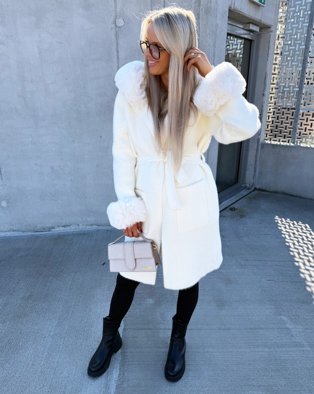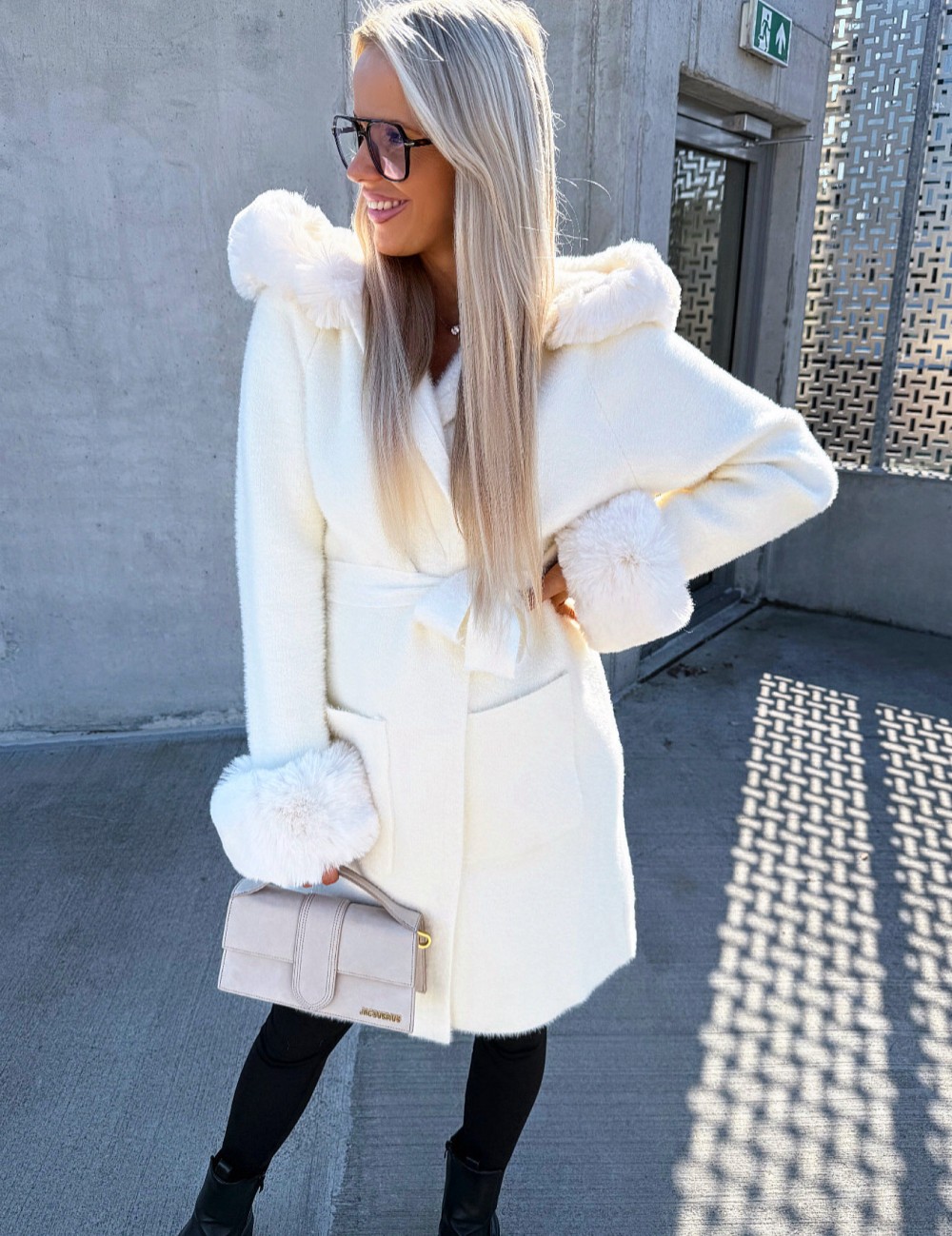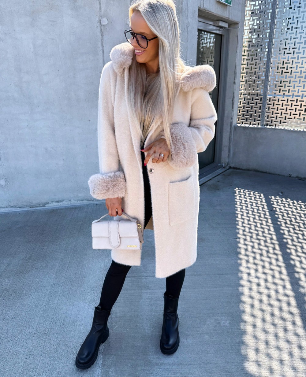 Съемная отделка из искусственного меха на рукавах и капюшоне.
