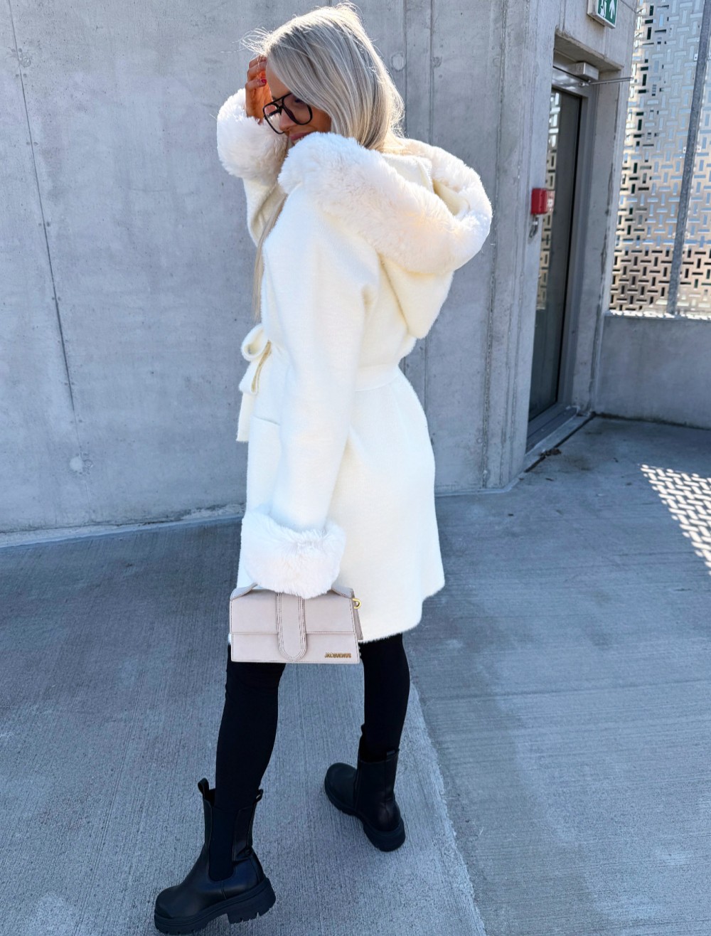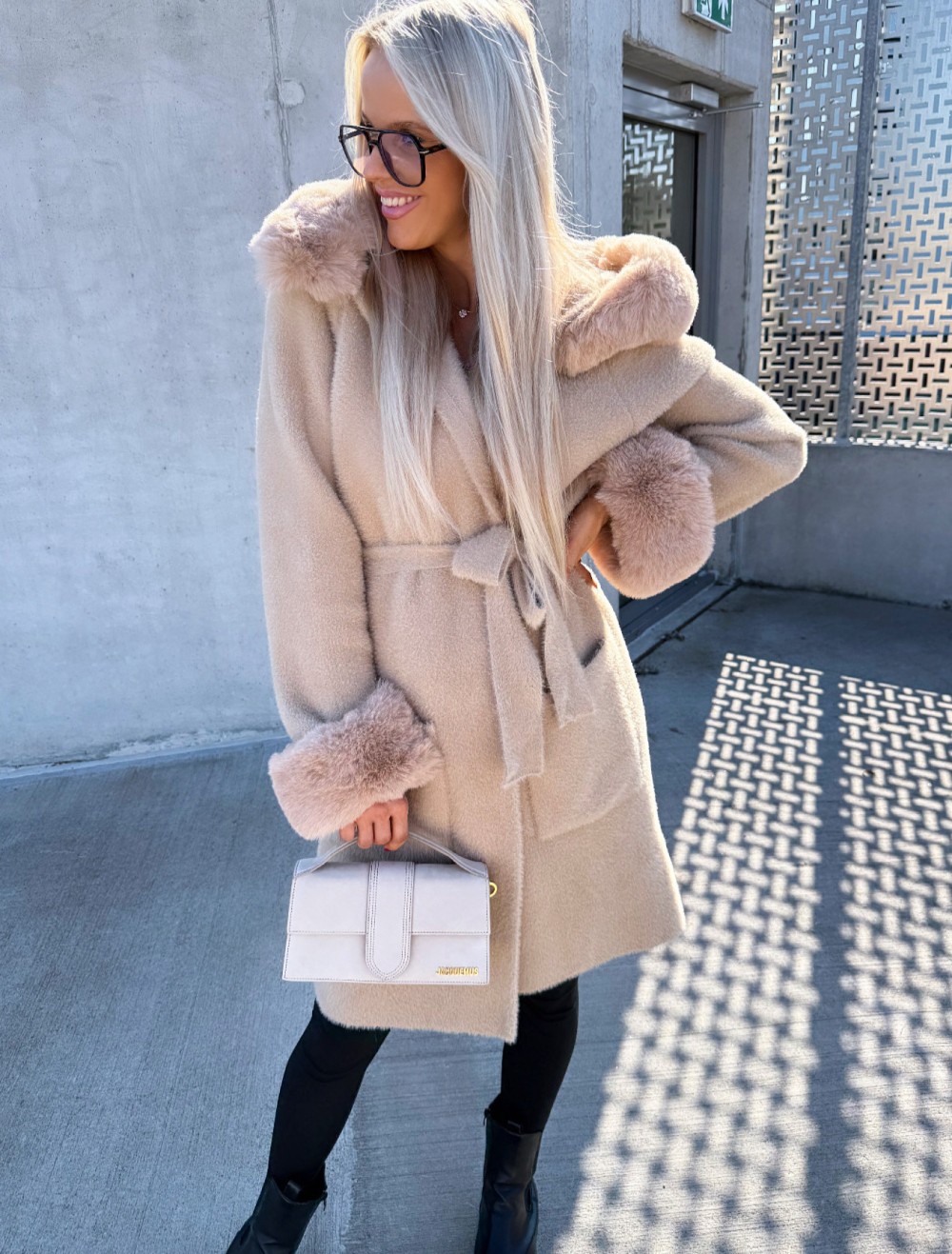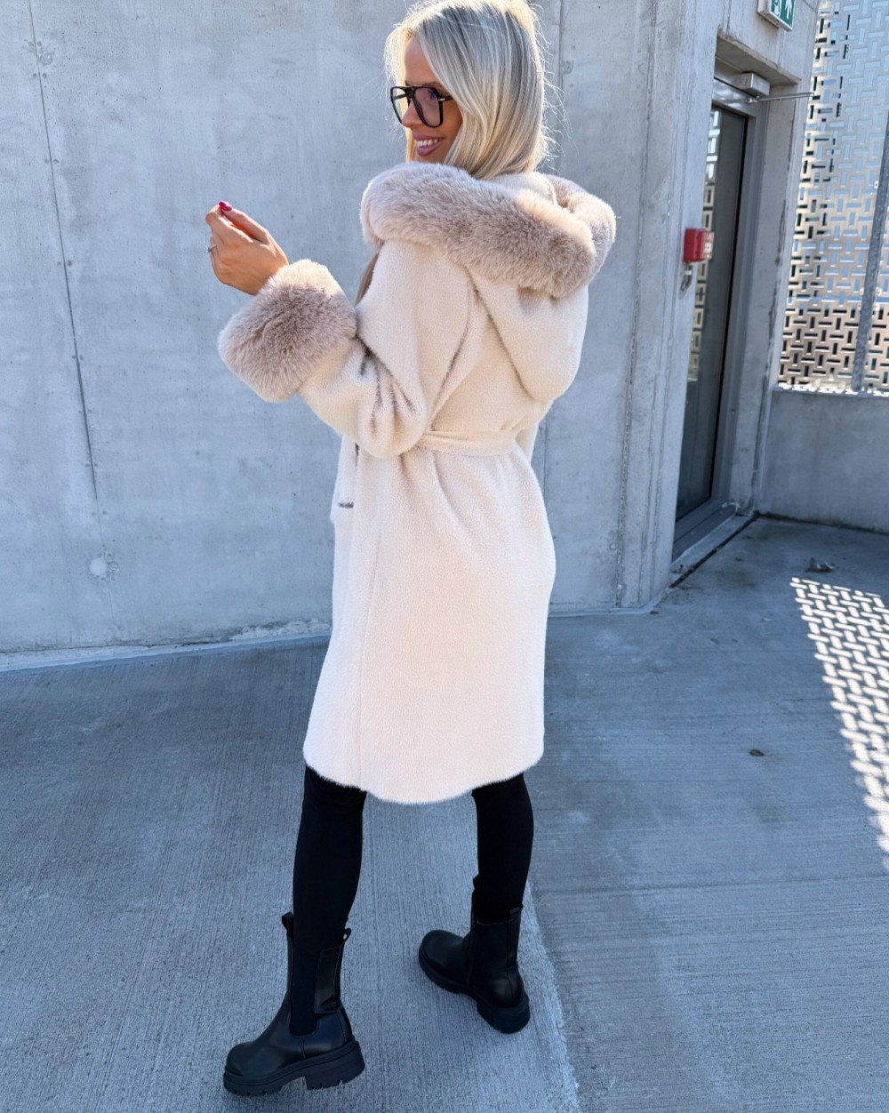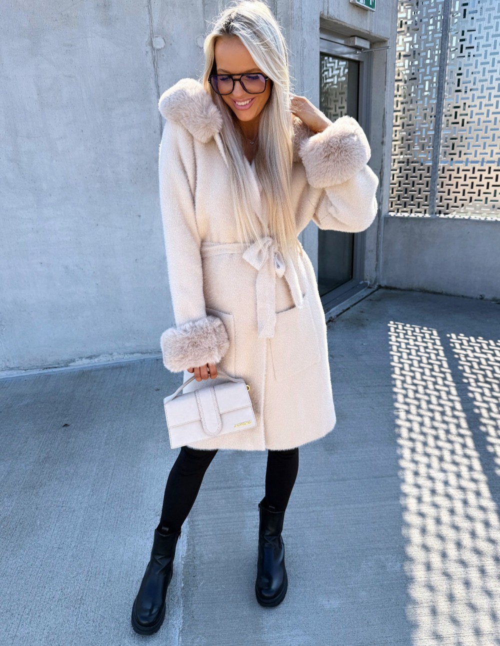 Съемная отделка из искусственного меха на рукавах и капюшоне.