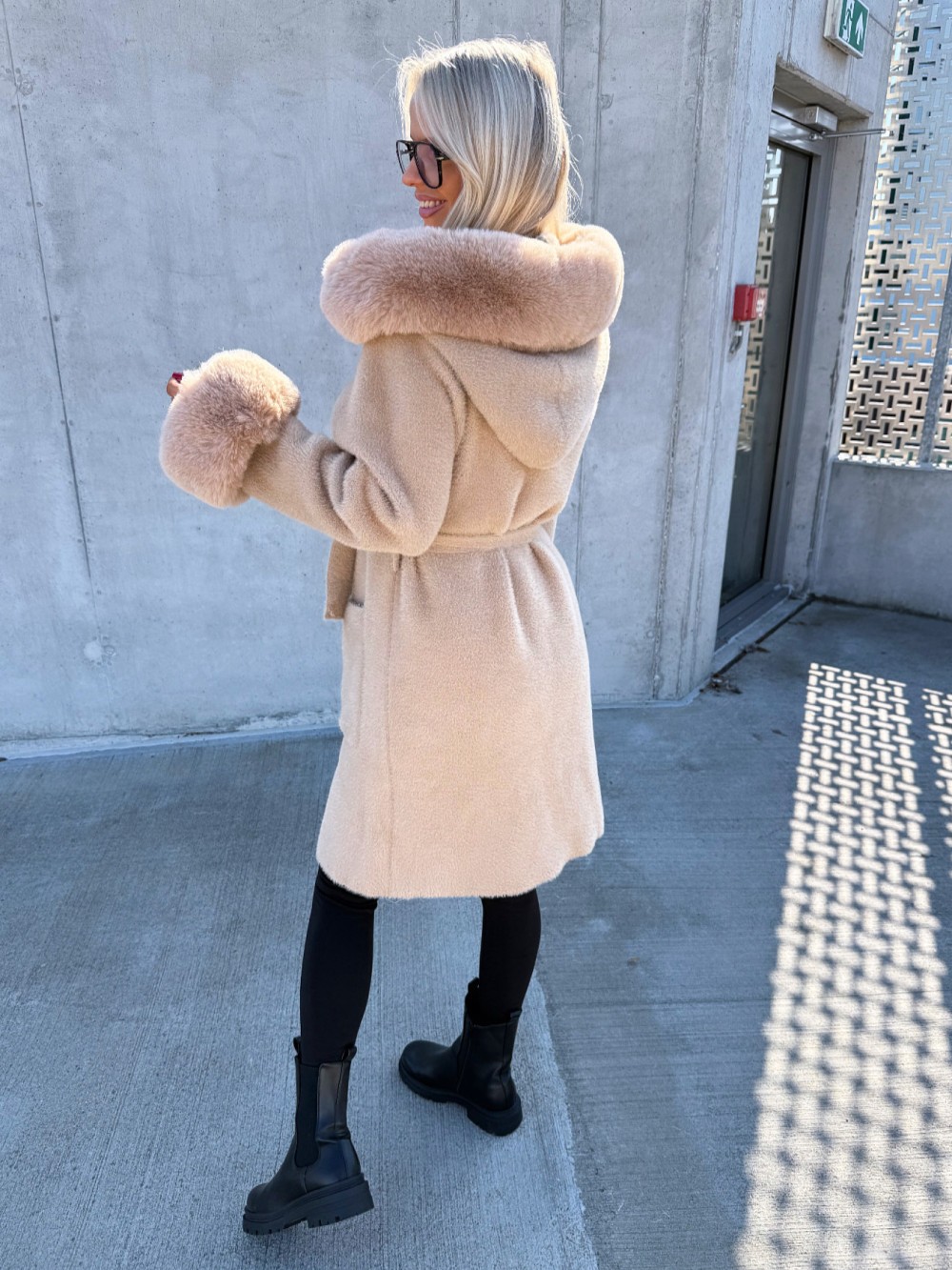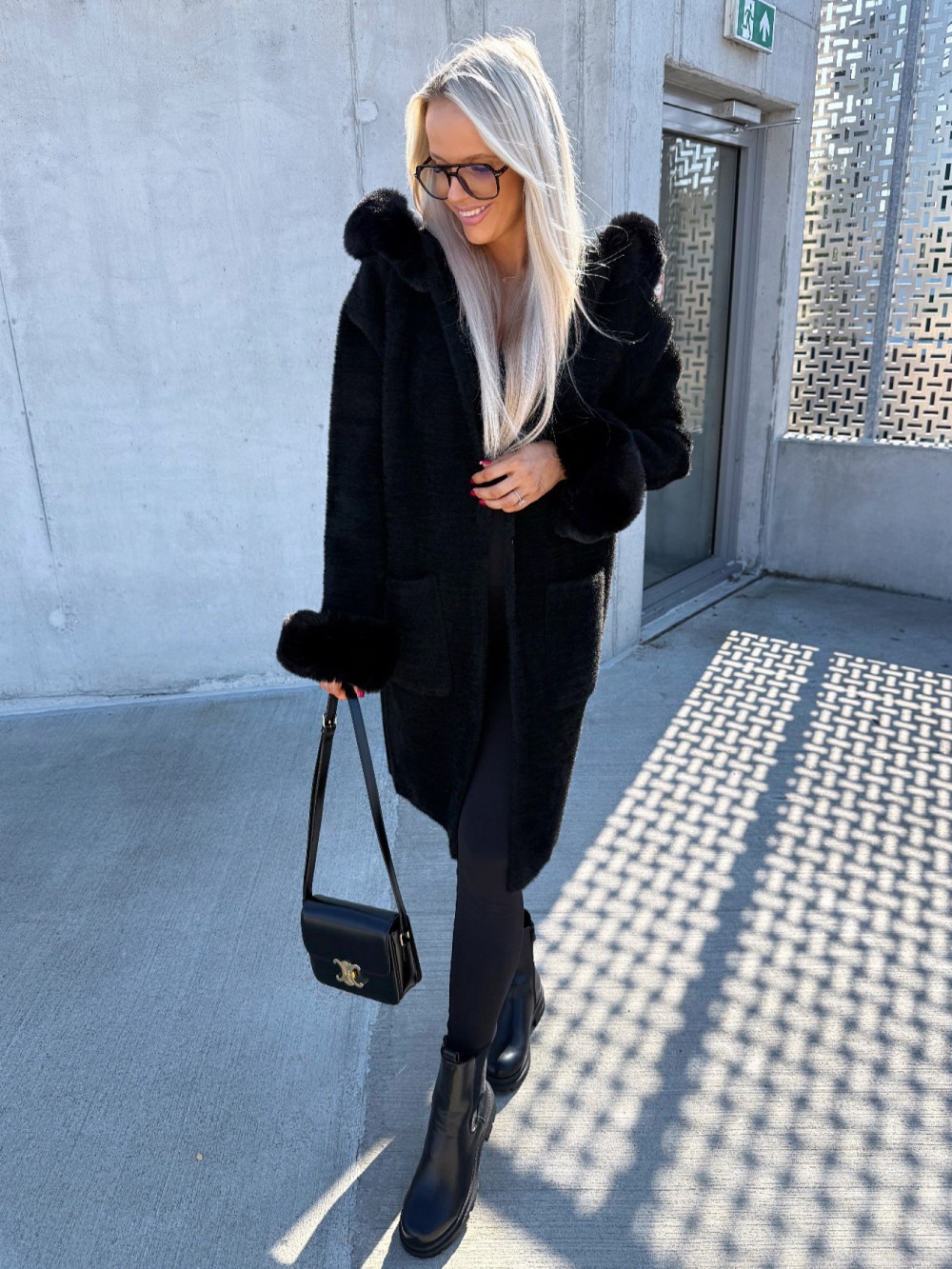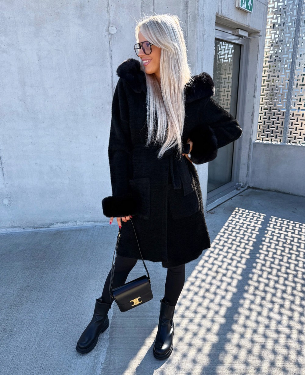 Тёплая альпака-куртка с капюшоном и поясом (Один размер, Черный)